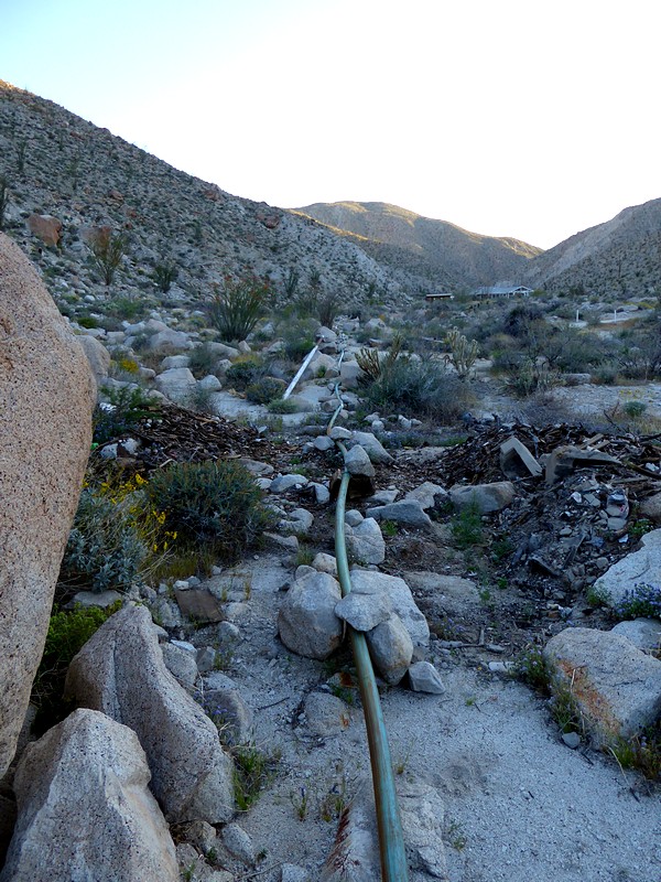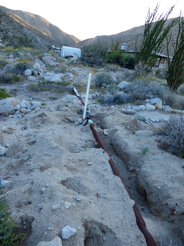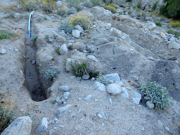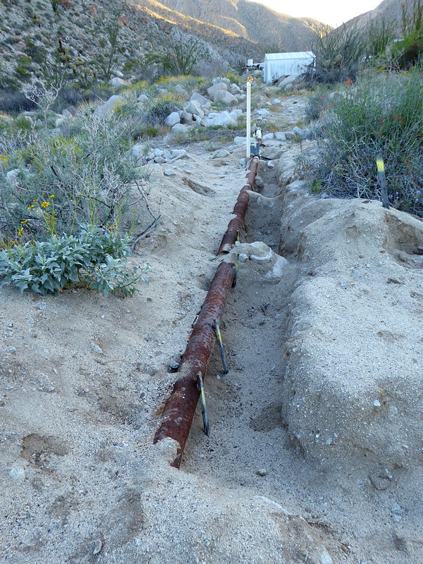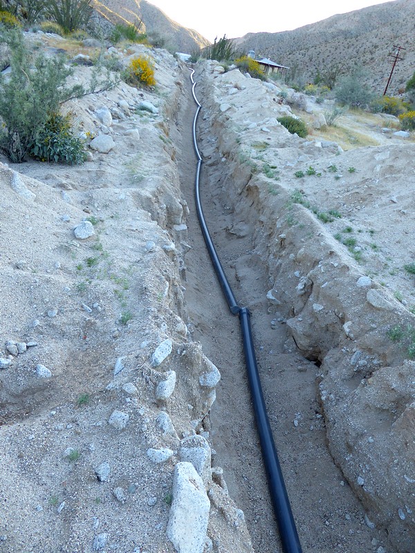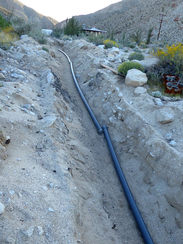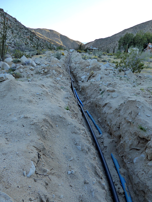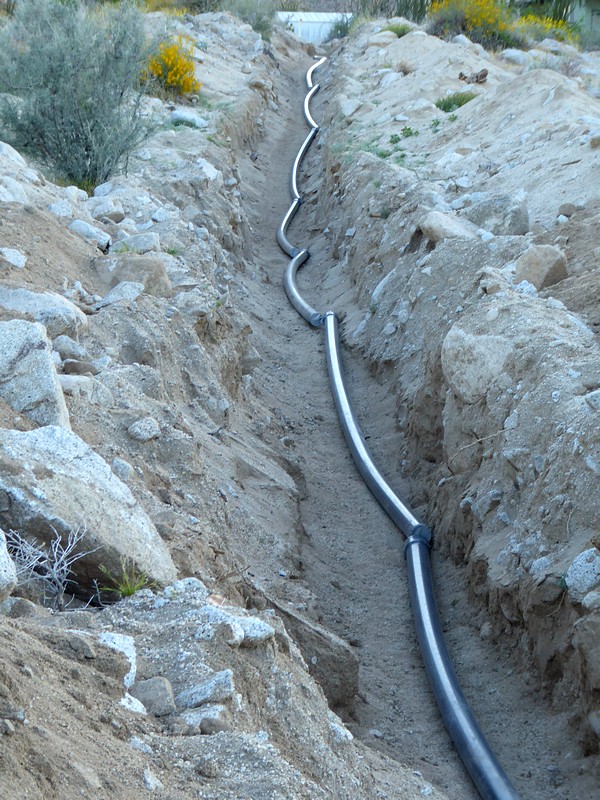 This is the lowest portion of the trench and new pipe. This is the view up the canyon. The light blue pipe is the existing pipe. The dark blue pipe is the replacement, 3 inch pipe. |