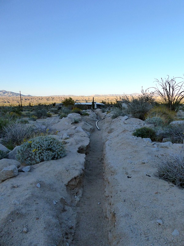 Looking up the trench. The trench has been dug but no pipe in here yet. Here, 4 20 foot lengths of pipe presently stored in at Ann Whitley's will be laid to complete the first section of new pipe. |