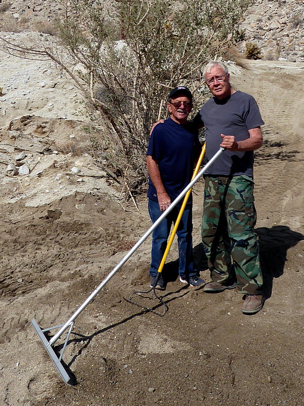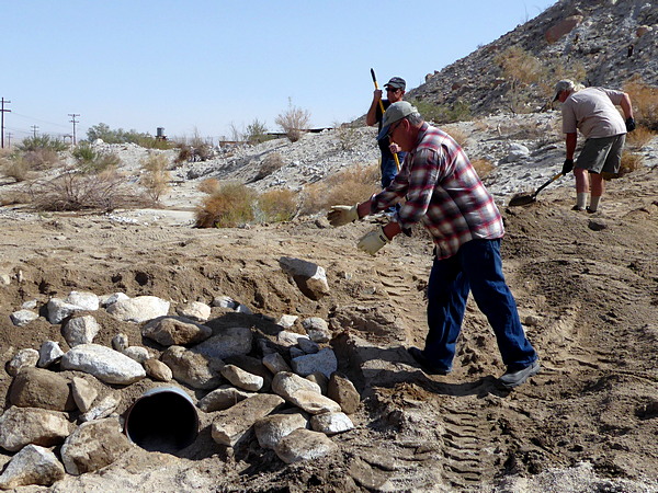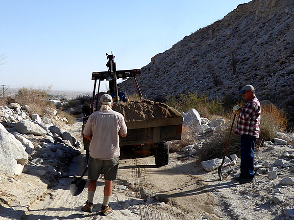 | Next Ron scooped sand from the wash to fill the gap in the road. |