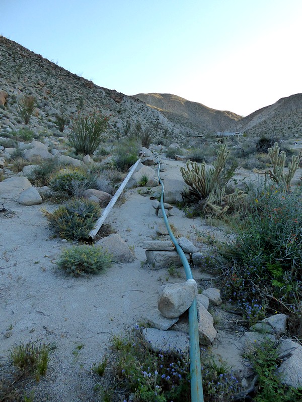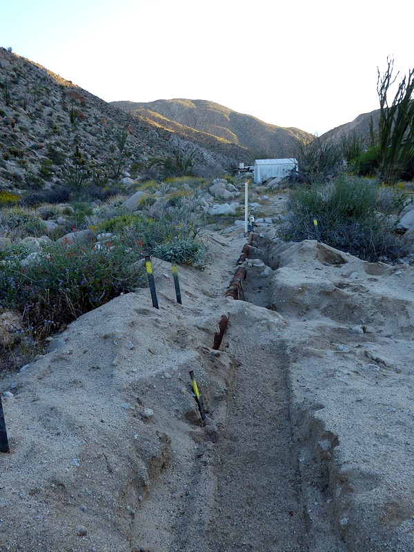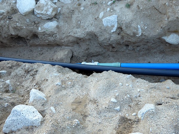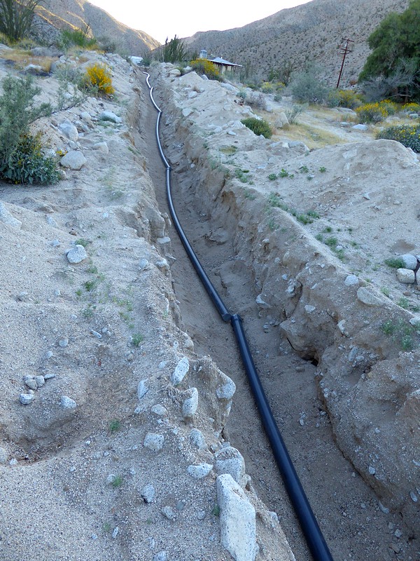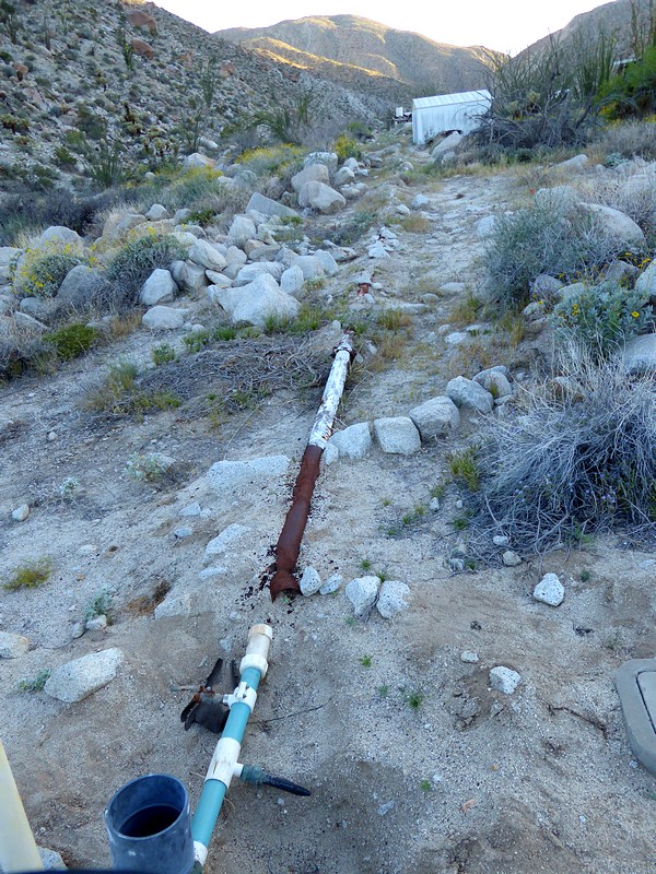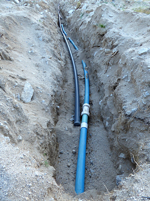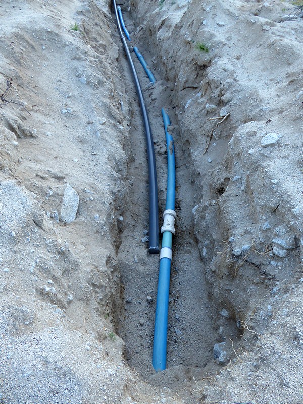 This is the lowest portion of the trench and new pipe. This is the view up the canyon. The light blue pipe is the existing pipe. The dark blue pipe is the replacement, 3 inch pipe. |
