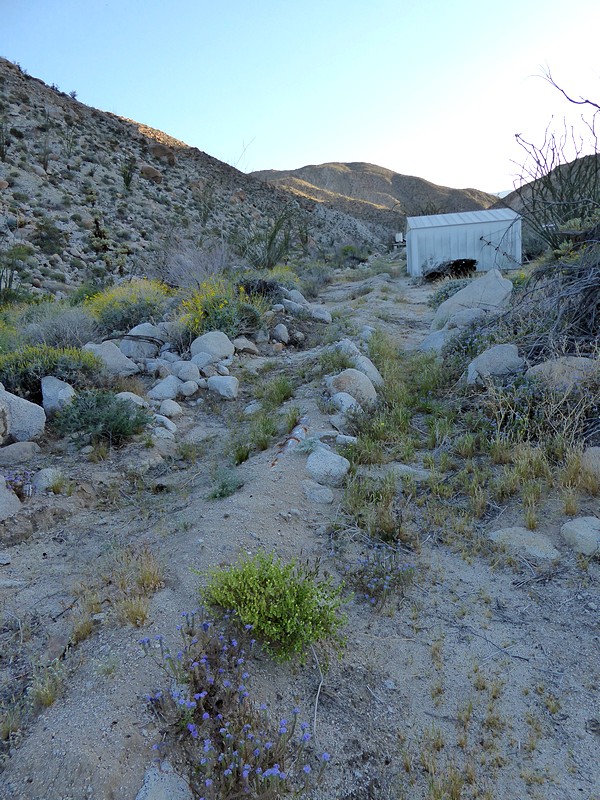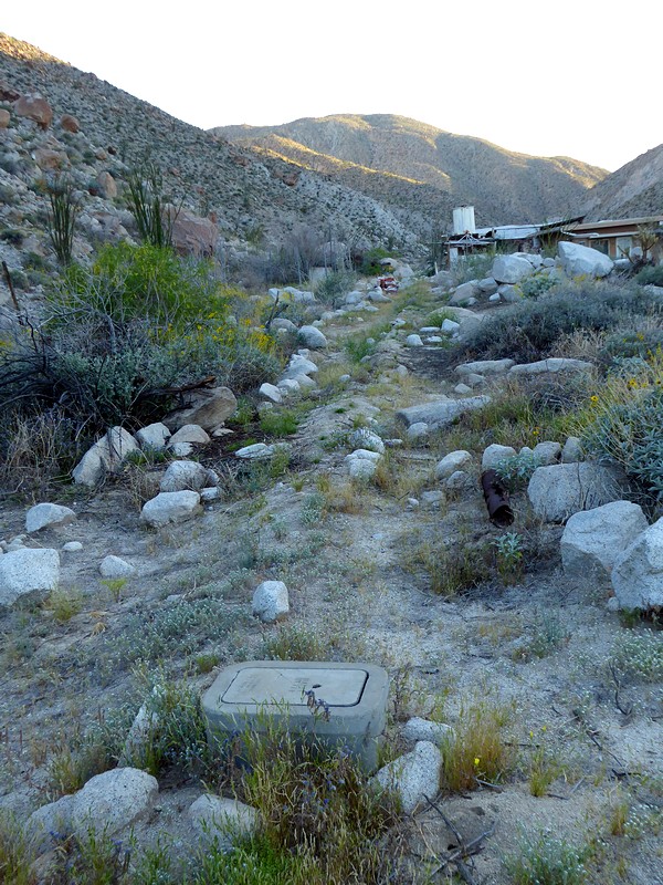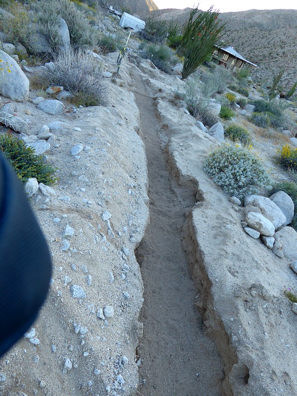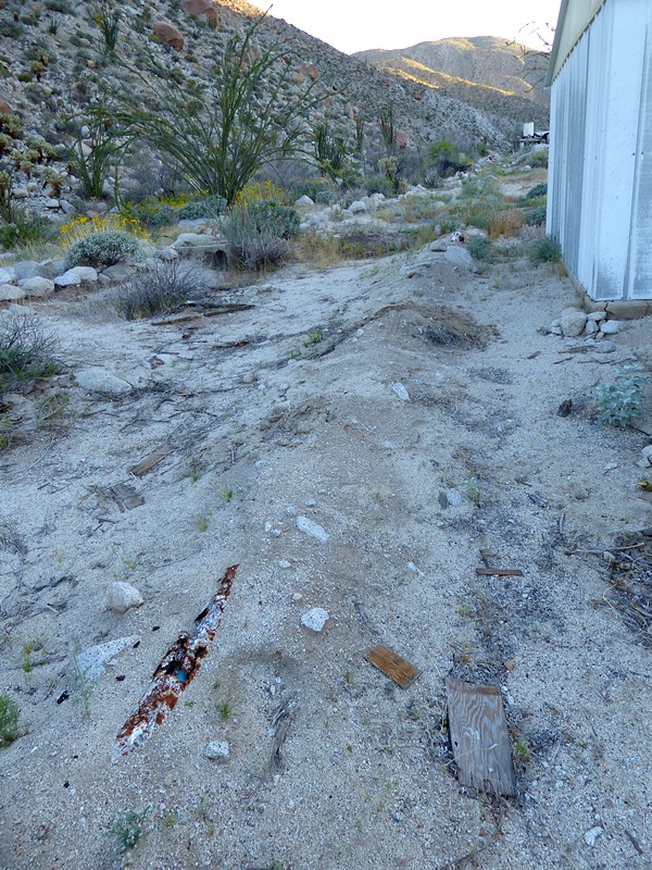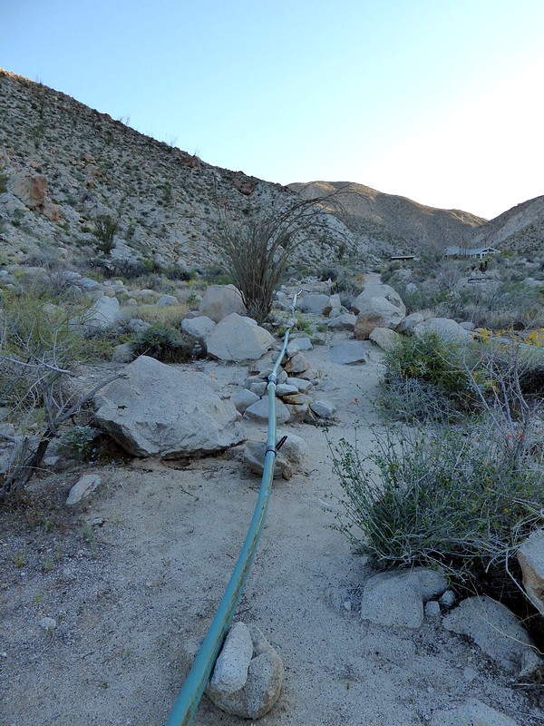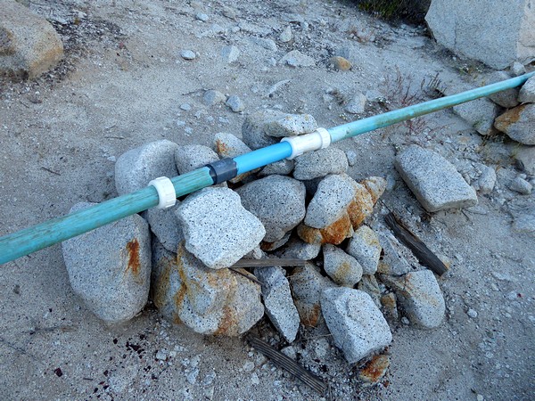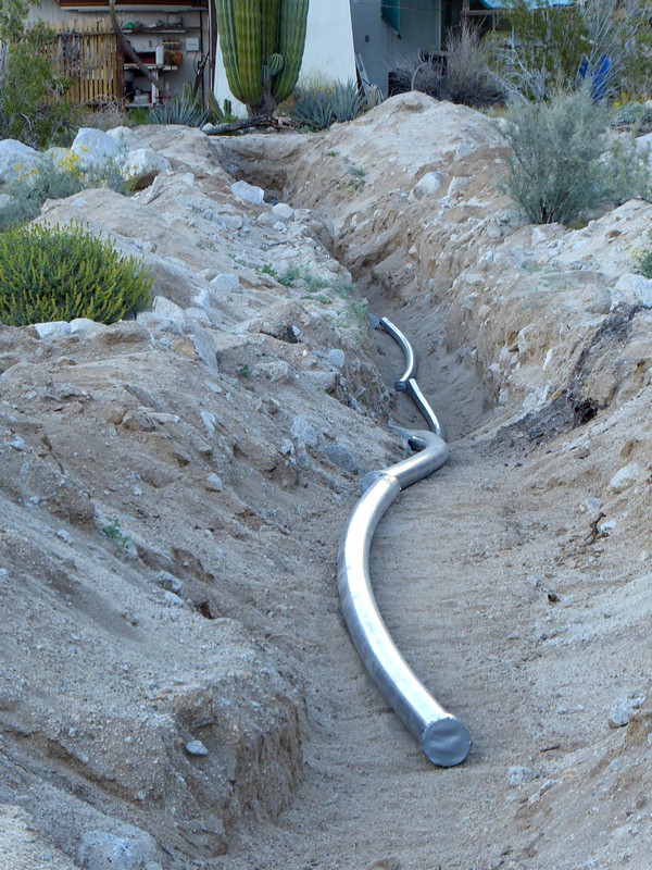 This is the lowest portion of the trench and new pipe. This is the view up the canyon. The light blue pipe is the existing pipe. The dark blue pipe is the replacement, 3 inch pipe. |