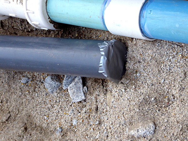 Close-up of one end of the new (gray) pipe. Each length of pipe was sanitized and carefully capped before being placed in the trench. |
