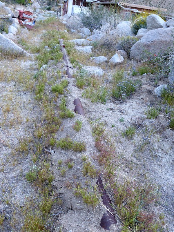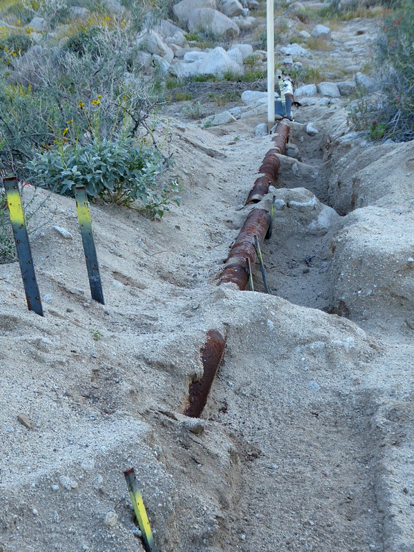 The pipe has been patched a bit here. This is where the new 3 inch pipe will tie in to the 2 inch pipe. From this point on, in increments of 3, 20 foot lengths of pipe, will replace the present 2 inch pipe. |