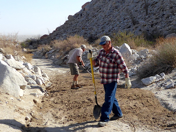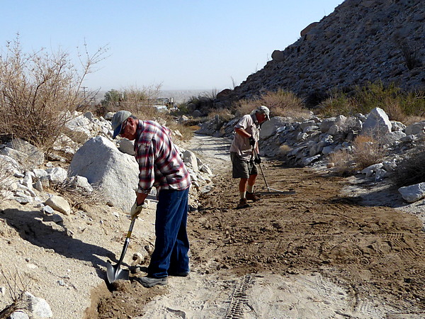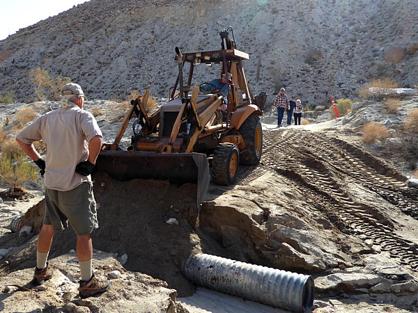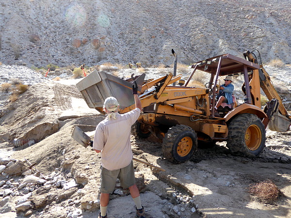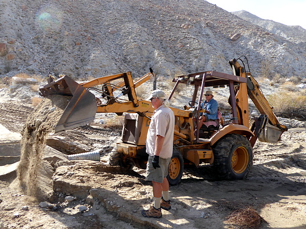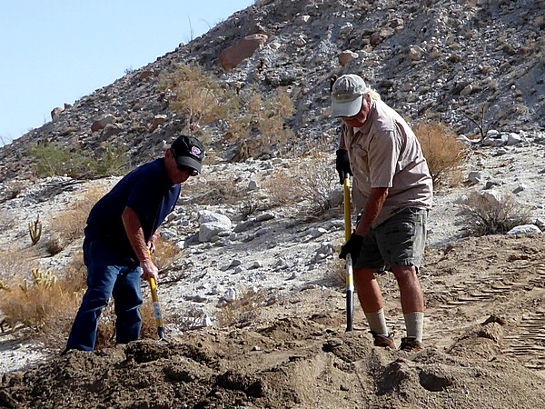 | Next Ron scooped sand from the wash to fill the gap in the road. |